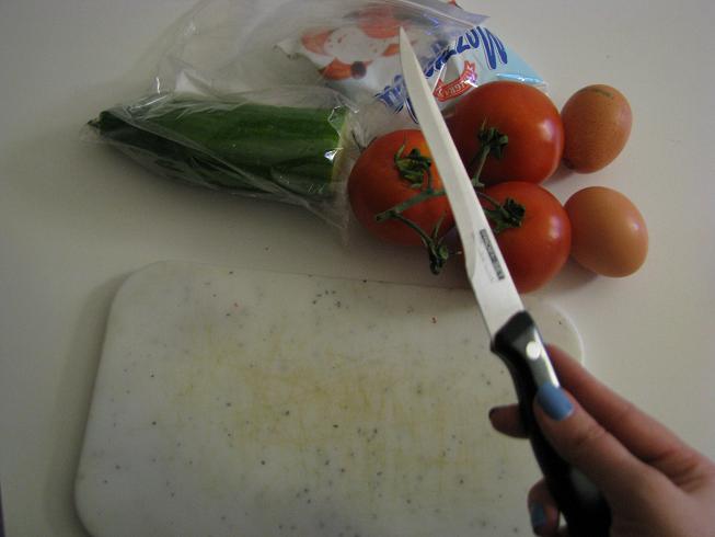 | Wieder zuhause das Abendessen geschnippelt: ein leckerer Salat (bei dem mir die Essigflasche ausgerutscht ist *wein) |