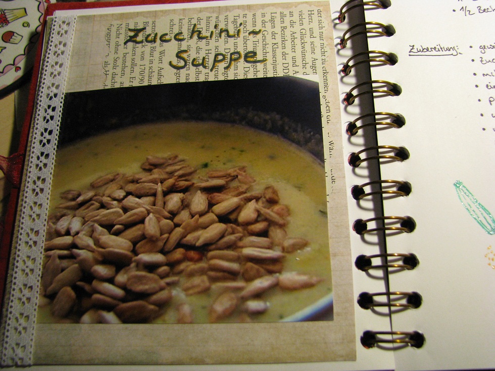 Die Vorgeschichte ist schnell zusammen gefasst: Ich habe zwar eine kleine Sammlung an Rezepten – aber diese ist teilweise im Blog, teilweise sehr unschön irgendwo in meinen Ordnern abgeheftet – da findet man nicht immer gleich das Gesuchte. Deswegen habe ich beschlossen, ein kleines Rezeptbuch zu schreiben. Da das ohne Bilder aber nur halb so lustig ist, sollte das mein erstes „richtiges“ Projekt werden, um mich am Scrapbooken zu versuchen. Das schöne ist ja, dass ich das nicht unter Zeitdruck fertig bekommen muss, sondern lediglich je nach Laune machen kann. ^^ Und da die Seiten so herrlich klein sind, sieht man auch recht schnell Ergebnisse. Hier nun also mein Erstes: