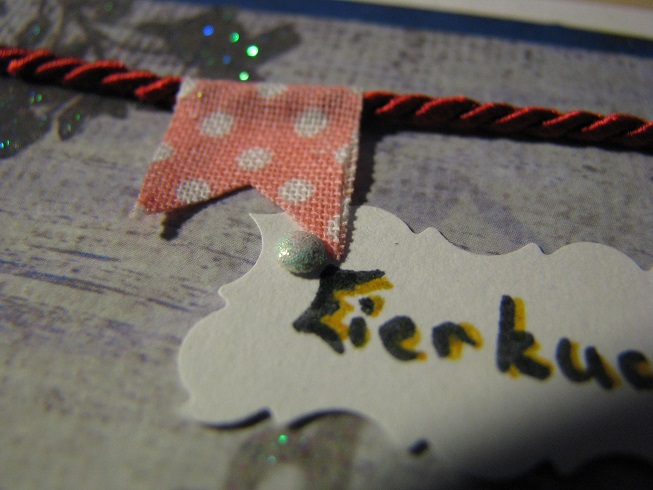 Es ist das erste Mal, dass ich nicht nur ein normales Papier benutze, sondern einen einfarbigen Tonkarton als Hintergrund! Der alleine war mir aber noch zu langweilig, darum gab es ein kleines Reststück eines Papiers, das ich mal im Müller gefangen habe (ich weiß gar nicht, ob das eine besondere Marke ist?). Deko ist dieses Mal eher schlicht mit einer roten Kordel (irgendwo gefunden) und drei Tapes als Fähnchen zurecht geschnitten ^^ (ich glaube, das habe ich entweder bei Miss Blogger gesehen oder auf einem anderen Blog … aber das fand ich sehr niedlich ^^). Das Schildchen ist traditionell wieder mit der Barock-Zackenschere aufgehübscht und dann mit den reddy cards Mini-Musterklammern, die ich von elen zum Geburtstag bekommen habe, befestigt. Zum Abschluss habe ich den Rand noch mit goldener Farbe etwas gepimpt…