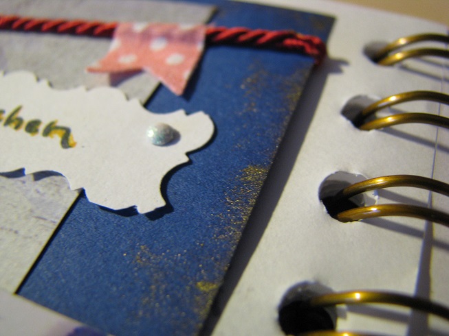 Es ist das erste Mal, dass ich nicht nur ein normales Papier benutze, sondern einen einfarbigen Tonkarton als Hintergrund! Der alleine war mir aber noch zu langweilig, darum gab es ein kleines Reststück eines Papiers, das ich mal im Müller gefangen habe (ich weiß gar nicht, ob das eine besondere Marke ist?). Deko ist dieses Mal eher schlicht mit einer roten Kordel (irgendwo gefunden) und drei Tapes als Fähnchen zurecht geschnitten ^^ (ich glaube, das habe ich entweder bei Miss Blogger gesehen oder auf einem anderen Blog … aber das fand ich sehr niedlich ^^). Das Schildchen ist traditionell wieder mit der Barock-Zackenschere aufgehübscht und dann mit den reddy cards Mini-Musterklammern, die ich von elen zum Geburtstag bekommen habe, befestigt. Zum Abschluss habe ich den Rand noch mit goldener Farbe etwas gepimpt…