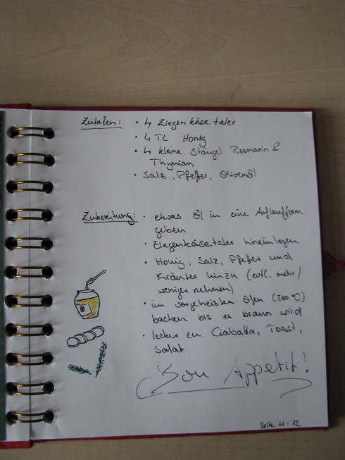 … zum Abschluss wieder die Rezeptseite. Die kryptischen zeichnungen sind die Taler, Rosmarin und Honig. XD |