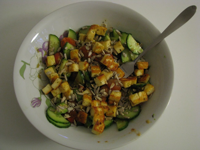 ital. Kräutern, dazu Grillkäse, Gurke und Sonnenblumenkerne.