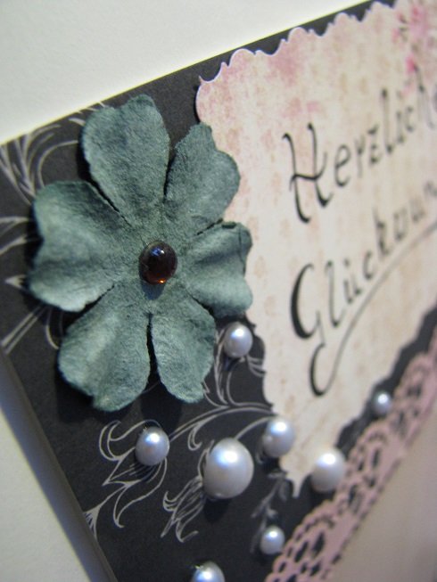 Verwendet habe ich u.a. Papiere von Xenos und Authentique (Cherish Collection), dazu zahlreiche Halbperlen (Müller), Stoffblumen (ich brauch dringend neue!) und wie gesagt die schöne selbstklebende Spitze (Depot).