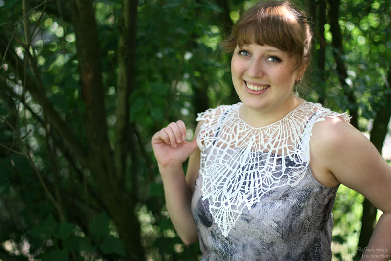 Mehr Infos zu dem wunderschönen Kleid – und auch noch einige Bilder mehr ^^ – gibt es heute übrigens auch bei Iv im Blog. Schaut unbedingt vorbei, es lohnt sich 😀 Denn schon allein dieser Spitzenkragen ist großartig – und bildet hinten übrigens auch noch mal einen tollen Hingucker 😉